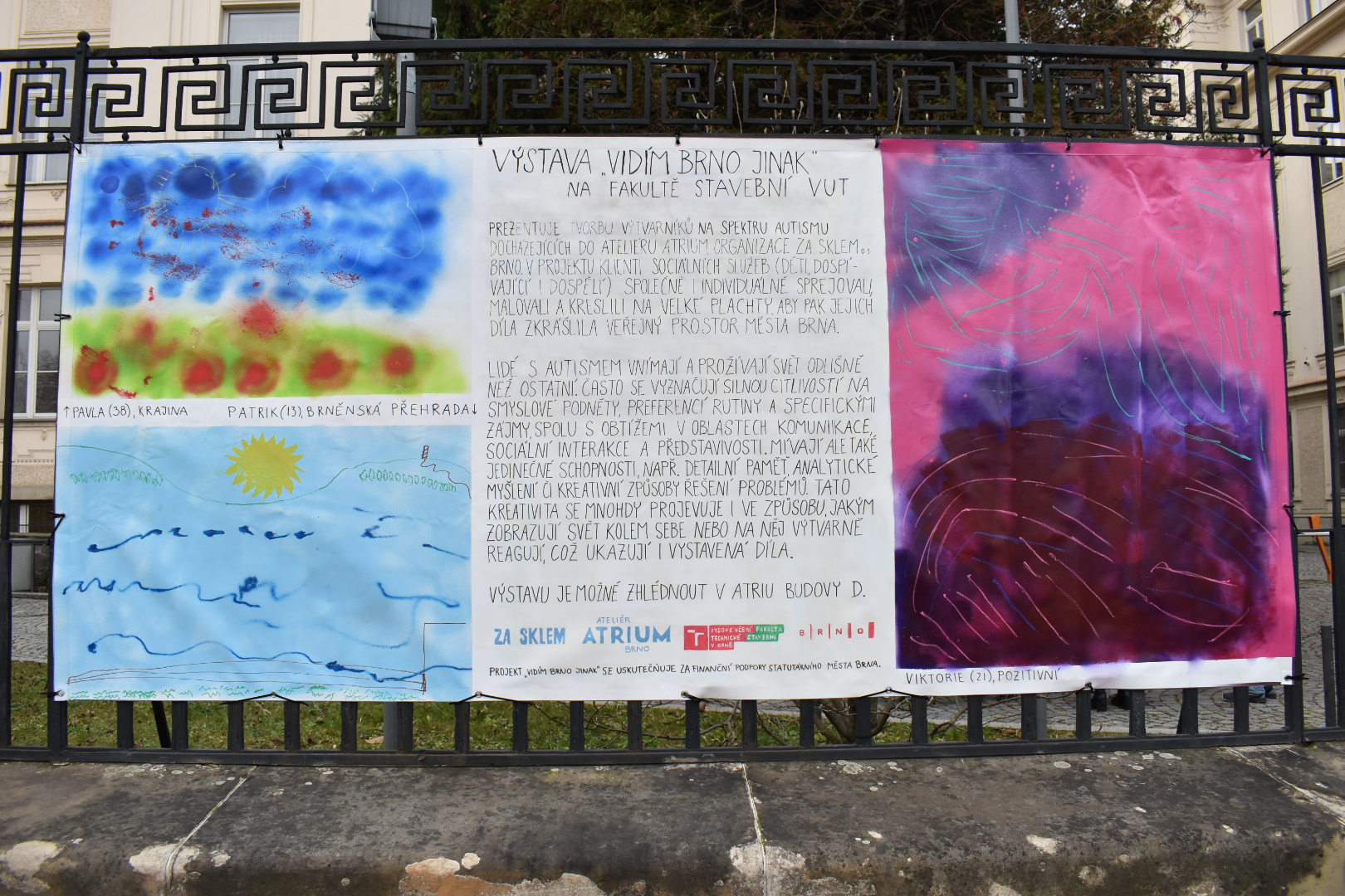 Výstava „VIDÍM BRNO JINAK“, kterou můžete shlédnout v prostorách atria budovy D3 na Fakultě stavební VUT v areálu Veveří 95, prezentuje tvorbu výtvarníků na spektru autismu působících v Ateliéru ATRIUM organizace Za sklem o. s. – Brno, která pomáhá lidem na spektru autismu a jejich blízkým v Jihomoravském kraji od roku 2021. V projektu klienti sociálních služeb různého věku společně i individuálně sprejovali, malovali a kreslili na recyklované bannery, aby pak jejich díla zkrášlila veřejný prostor města Brna. Lidé s autismem vnímají a prožívají svět odlišně než ostatní. Časté jsou silná citlivost na smyslové podněty, preference rutiny a specifické zájmy, spolu s obtížemi v oblastech komunikace, sociální interakce a představivosti. Mívají ale také jedinečné schopnosti, např. detailní paměť, analytické myšlení či kreativní způsoby řešení problémů. Kreativita se mnohdy projevuje i ve způsobu, jakým zobrazují okolní svět nebo na něj výtvarně reagují, což dokazují i vystavená díla. Výstavu můžete navštívit do 10. ledna 2025 v pracovních dnech od 8.00 do 18.00 hodin.